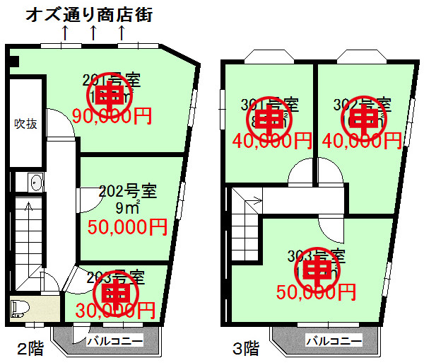 | 設備・条件 | 事務所可 定期借家権 トイレ共同 エアコン 防犯カメラ レンタルスペース・飲食店不可。業種などご相談ください。